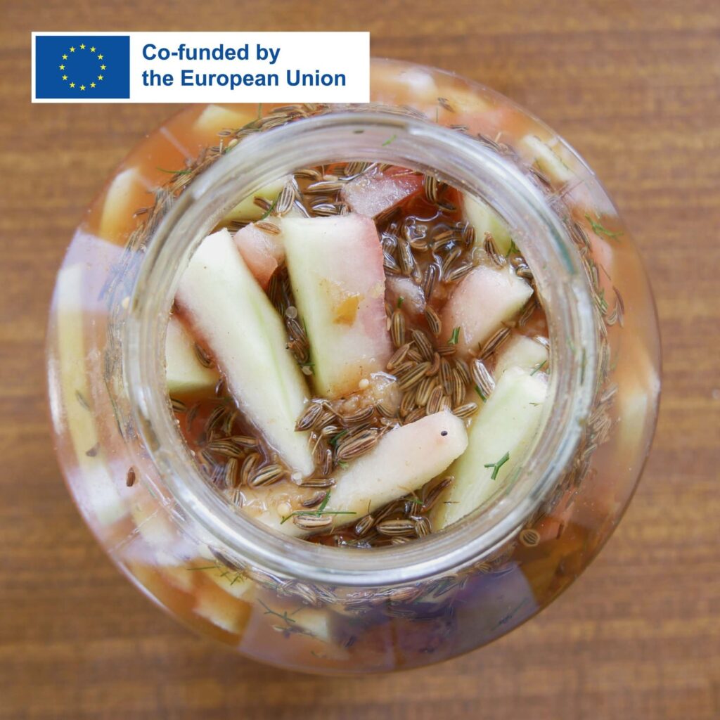 To do this, I prepared a sour brine that would allow the pickles to ferment quickly, mixing homemade vinegar and water. I then added pear jam and cardamom for sweetness, red chilli and mustard seeds for spiciness, and a variety of herbs to add flavour and saltiness: fennel, caraway and cumin seeds, as well as fennel fresh leaves. After cutting the watermelon rind, removing the thin dark green layer that is not edible, I cut it into sticks and placed them in a jar. Then I boiled the brine and poured it into the jar until it covered the watermelon rind sticks. After that, all that remained to be done was to close the jar, wait for it to cool, keep it in the fridge for a few days, and enjoy these recycled pickles !